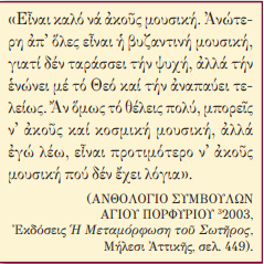 «Εἶναι καλό νά ἀκοῦς μουσική. Ἀνώτερη ἀπ᾿ ὅλες εἶναι ἡ βυζαντινή μουσική, γιατί δέν ταράσσει τήν ψυχή, ἀλλά τήν ἑνώνει μέ τό Θεό καί τήν ἀναπαύει τελείως. Ἄν ὅμως τό θέλεις πολύ, μπορεῖς ν᾿ ἀκοῦς καί κοσμική μουσική, ἀλλά ἐγώ λέω, εἶναι προτιμότερο ν᾿ ἀκοῦς μουσική πού δέν ἔχει λόγια».