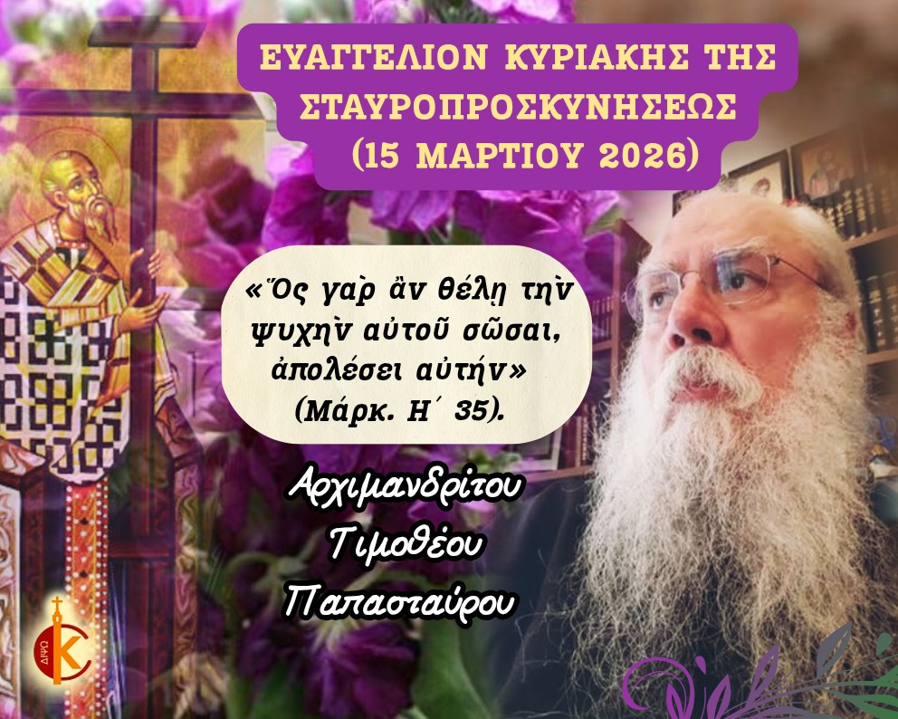 ΕΥΑΓΓΕΛΙΟΝ ΚΥΡΙΑΚΗΣ ΤΗΣ ΣΤΑΥΡΟΠΡΟΣΚΥΝΗΣΕΩΣ (15 ΜΑΡΤΙΟΥ 2026) «Ὅς γὰρ ἂν θέλῃ τὴν ψυχὴν αὐτοῦ σῶσαι, ἀπολέσει αὐτήν» (Μάρκ. Η΄ 35). Ποία[…]