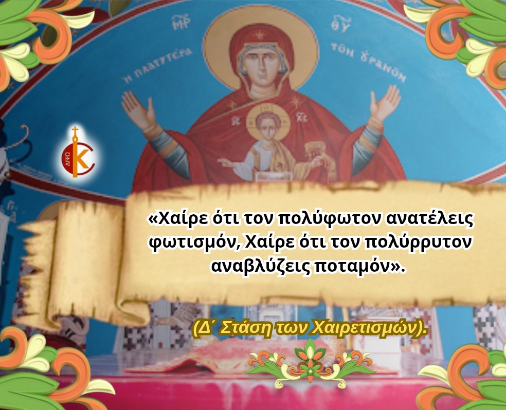 «Χαίρε ότι τον πολύφωτον ανατέλεις φωτισμόν, Χαίρε ότι τον πολύρρυτον αναβλύζεις ποταμόν». (Δ΄ Στάση των Χαιρετισμών). «Χαίρε[…]