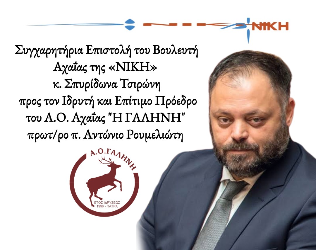 Συγχαρητήρια επιστολή προς τον Ιδρυτή και Επίτιμο Πρόεδρο του Α.Ο. Αχαΐας “Η ΓΑΛΗΝΗ” πρωτ/ρο π. Αντώνιο Ρουμελιώτη,[…]