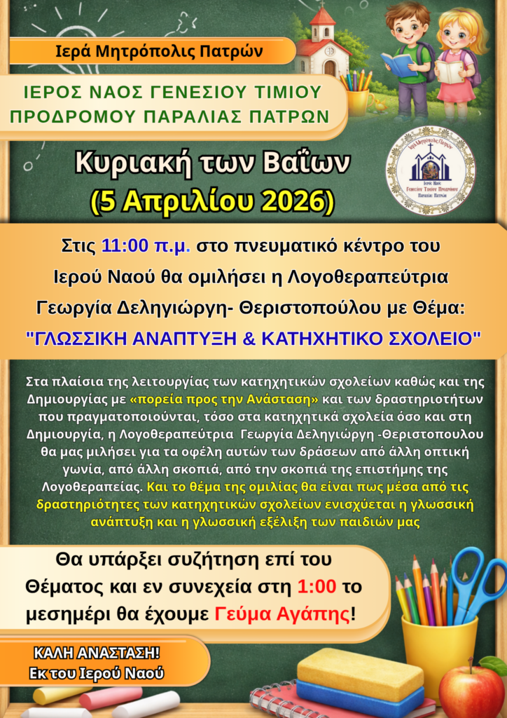 Στα πλαίσια της λειτουργίας των κατηχητικών σχολείων καθώς και της Δημιουργίας με πορεία προς την Ανάσταση και των δραστηριοτήτων που πραγματοποιούνται, τόσο στα κατηχητικά σχολεία όσο και στη Δημιουργία, την Κυριακή των Βαΐων (5/4/2026) στις 11:00 στο Πνευματικό Κέντρο η Λογοθεραπεύτρια  Γεωργία Δεληγιώργη -Θεριστοπούλου θα μας μιλήσει για τα οφέλη αυτών των δράσεων από άλλη οπτική γωνία, από άλλη σκοπιά, από την σκοπιά της επιστήμης της Λογοθεραπείας. Και το θέμα της ομιλίας θα είναι πως μέσα από τις δραστηριότητες των κατηχητικών σχολείων ενισχύεται η γλωσσική ανάπτυξη και η γλωσσική εξέλιξη των παιδιών μας. Το θέμα μας ουσιαστικά θα είναι “Γλωσσική Ανάπτυξη & Κατηχητικό Σχολείο”