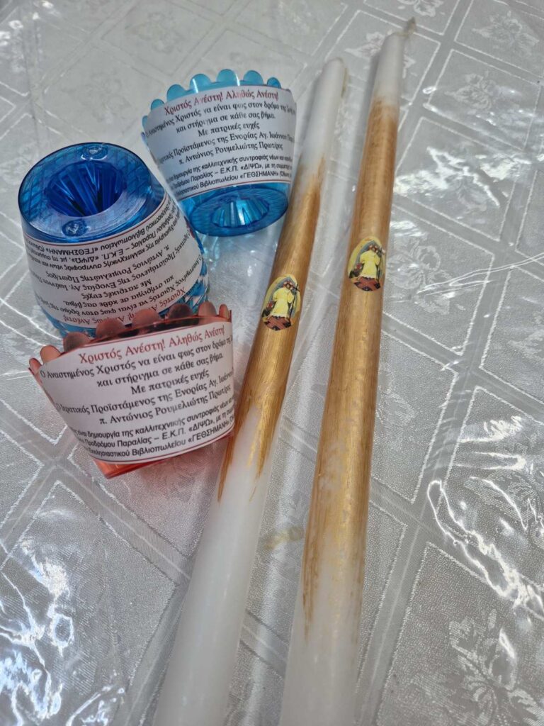 Τέλος, προέτρεψε τους Νέους και τις Νέες να πάνε την Μεγάλη Εβδομάδα στην Εκκλησία και να αξιωθούν να συμμετέχουν έως το τέλος της Αναστάσιμης Θείας Λειτουργίας με την Λαμπάδα που όπως κάθε χρόνο ετοίμασε η Καλλιτεχνική συντροφιά νέων και νεανίδων του Ιερού Ναού Γενεσίου Τιμίου Προδρόμου Παραλίας (Ε.Κ.Π. ΔΙΨΩ) με τη συμμετοχή των γονέων και την υποστήριξη του Εκκλησιαστικού Βιβλιοπωλείου “ΓΕΘΣΗΜΑΝΗ”(Όθωνος Αμαλίας 97) και μοιράστηκε ως δώρο του Ιερατικού Προϊσταμένου και Υπεύθυνου της Κατηχήσεως π. Αντωνίου Ρουμελιώτη.