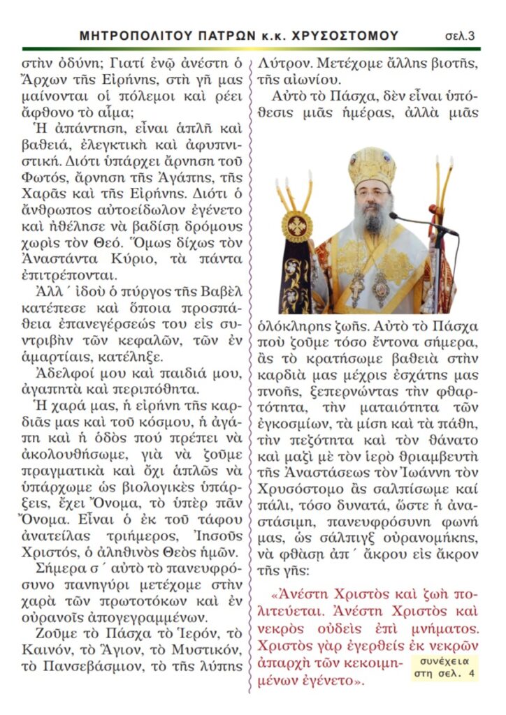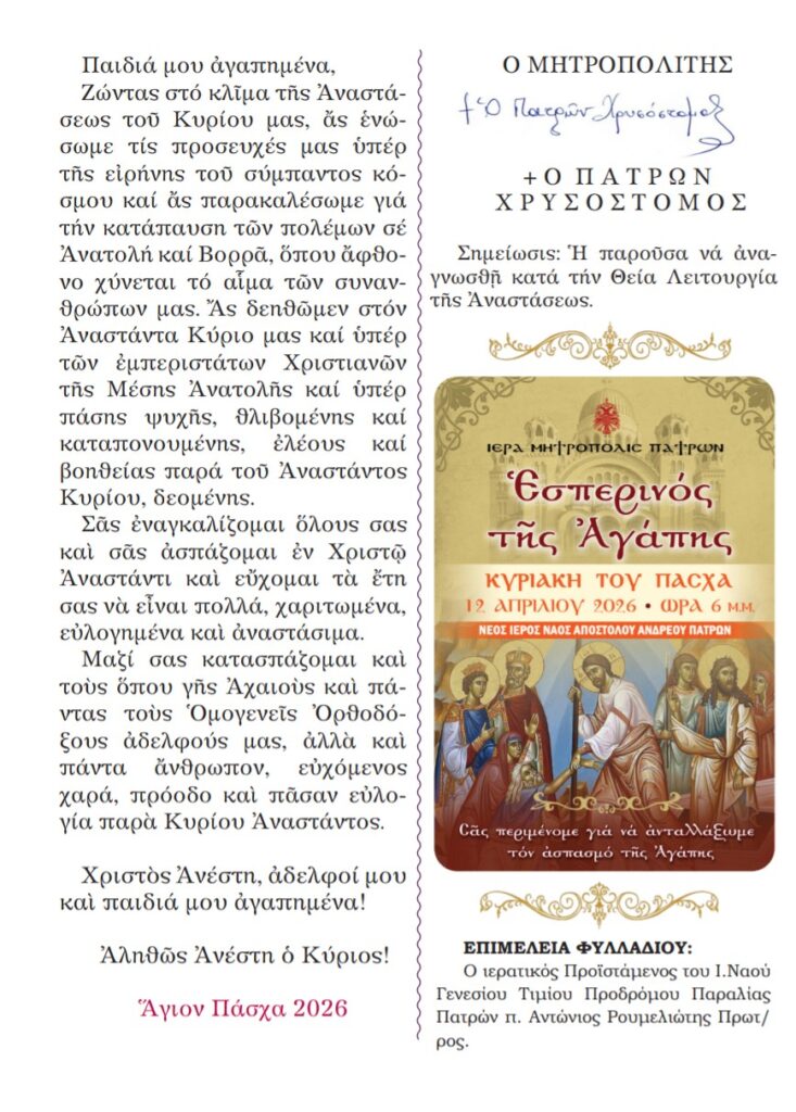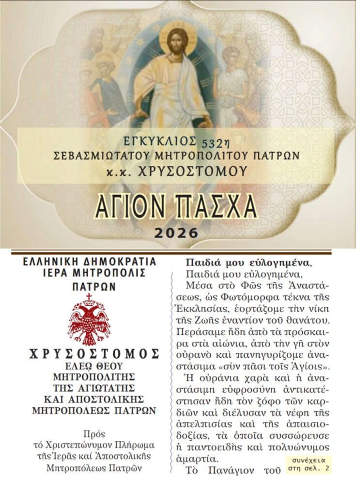 Εγκύκλιος 532η Σεβασμιωτάτου Μητροπολίτου Πατρών κ.κ. Χρυσοστόμου- ΑΓΙΟΝ ΠΑΣΧΑ 2026