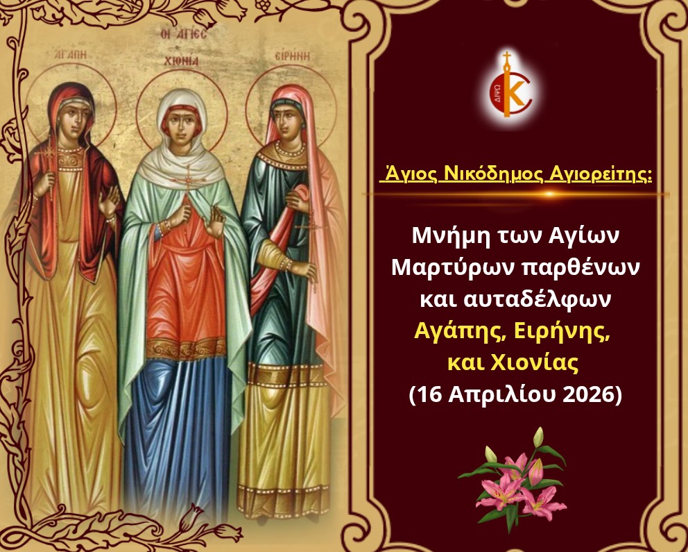 Μνήμη των Αγίων Μαρτύρων παρθένων και αυταδέλφων Αγάπης, Ειρήνης, και Χιονίας (16 Απριλίου 2026) – Άγιος Νικόδημος[…]